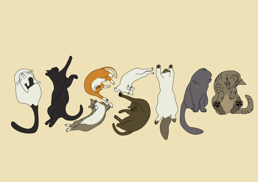 The second logos, designed to challenge the viewer’s brain by forcing it to see things from different angles and look for the letters, hidden within the shapes of the cats. By challenging a viewer’s perspective, it makes the product more memorable as they have to look closely at the design to see the hidden meaning. The background of the design is just a plain simple colour, this is so the detail on some the cats can still be seen and keeps the focal point on the mid section rather than the foreground or background.The colours used were simple – similar to the first design – as I still wanted the design to be readable for all age groups.