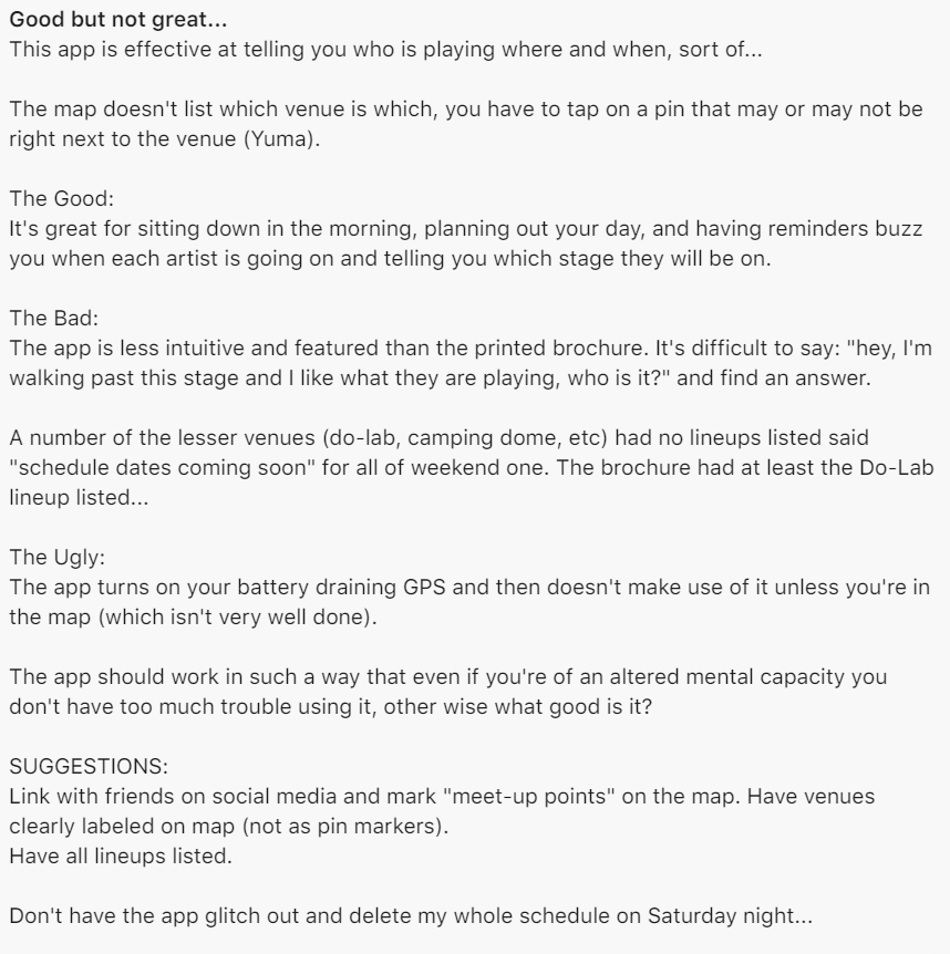 Some users have had issues with the map and cannot see the name of the stage/ name of the event location as it is hidden by a location pin marker – with some users unable to see it at all on other app platforms and in one of the reviews they said that ‘the app is less intuitive and featured than the brochure’ this would be an issue as it could lead to people not using the app which may mean people will not see key information.