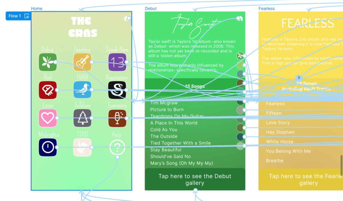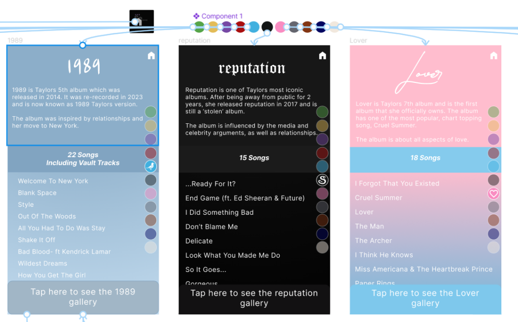 As each era had their own colour palette, there was no specific colour scheme to follow for the home page. To ensure that the homepage still had colour variations, the primary colour from Taylor’s first album and most recent album were put together to create a gradient, the colours were then slightly brightened and flipped around- so the first album colours is at the bottom and newest album colours is on top- so all eras icons could be seen.