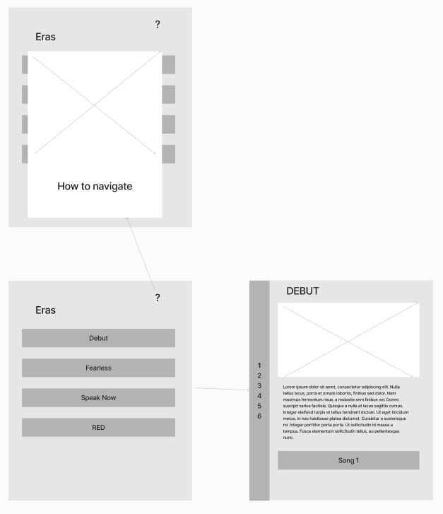 For the first wire frame, the design was made to make it easy for users to navigate, this was done by making a simple homepage with rows for the users to select the era they would like to look at – If a user does not understand how to navigate the site then they can click the question mark in the top right corner and it will display an overlay on how to navigate the site. When they click on an era, the page will load with an image at the top of the page with information about the album underneath, under the album information section, all the songs would be displayed with the meaning about it underneath.
