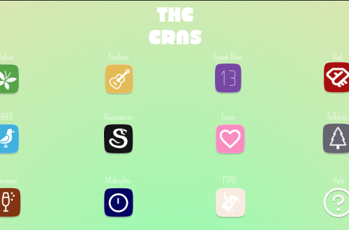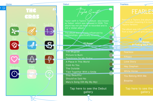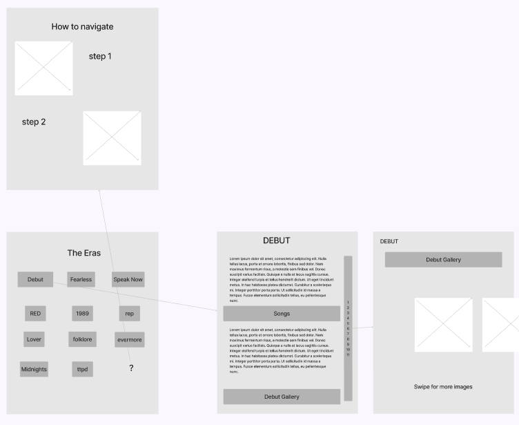 To improve on the design, the homepage has the eras displayed as if each one was an app on a phone, this makes the design familiar to the user which makes the interactivity more intuitive for the user. If a user does not understand how to navigate, they can click on the question mark and a different page will appear explaining how to use the app. When a user clicks onto an era, the page will load with the title of the album and information about it, beneath that information is the song titles that users can scroll through and click on the title of the song they want to know more about- when they click on a song a separate page will appear and have a brief description about it. The images have been moved to a separate page as well to make the app more visually appealing and less cluttered, when the ‘view [era]’s gallery’ is clicked, the page will load with a carousel of images for the users to swipe through.