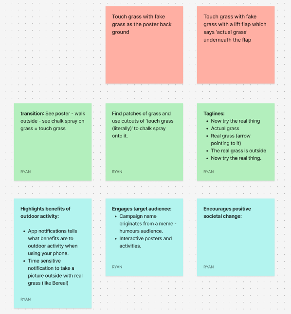 Overall, the campaign encourages positive change by promoting outdoor activity in a way that feels relevant to a digitally influenced generation. The humour, pop culture reference, and physical textures make it more engaging than a traditional health poster. The use of faux grass and outdoor placements, such as writing “touch grass – literally” in fields using chalk, also encourages people to physically encounter the campaign outside rather than through a screen. This makes the message more immersive and aligned with the aim of getting people to go outside more frequently.
